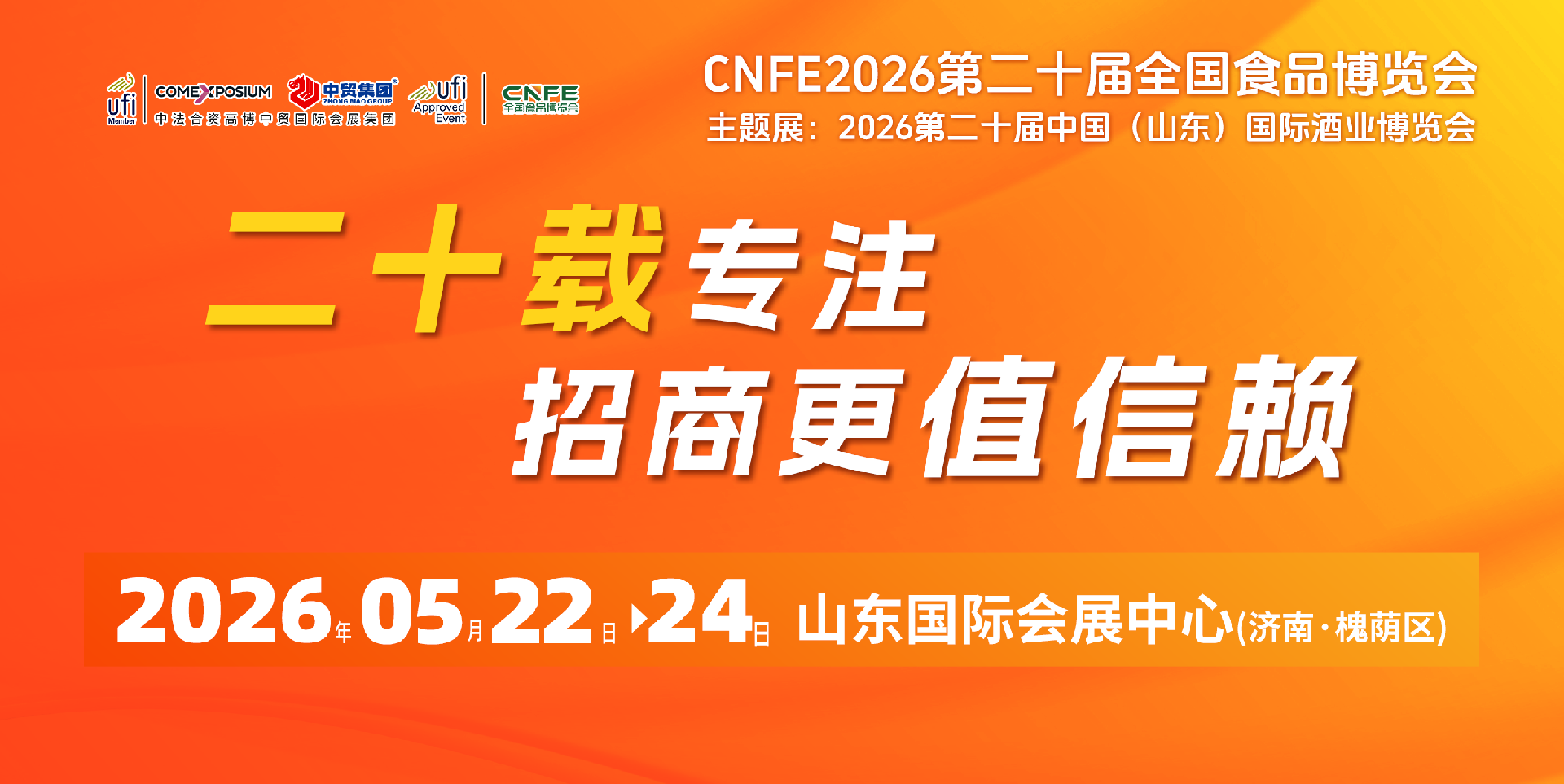 CNFE2026第二十屆全國食品博覽會(huì)將于2026年5月22-24日在濟(jì)南市山東國際會(huì)展中心舉辦。【主題展:2026第二十屆中國(山東)國際酒業(yè)博覽會(huì),同期展:···