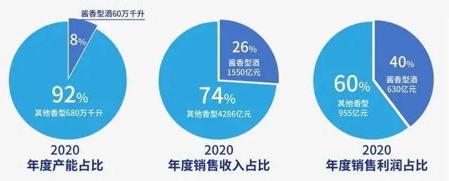 據(jù)有關(guān)數(shù)據(jù)統(tǒng)計顯示,2020年1-12月,中國醬香酒產(chǎn)業(yè)實現(xiàn)產(chǎn)能約60萬千升,同比增長約9%,約占中國白酒行業(yè)產(chǎn)能740萬千升的8%;實現(xiàn)行業(yè)銷售收入約1550億元,同比增長14%,約占中國白酒行業(yè)銷售5836億元的26%;實現(xiàn)行業(yè)銷售利潤約630億元,同比增長約14.5%,約占中國白酒行業(yè)利潤1585億元的39.7%。